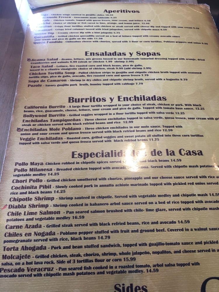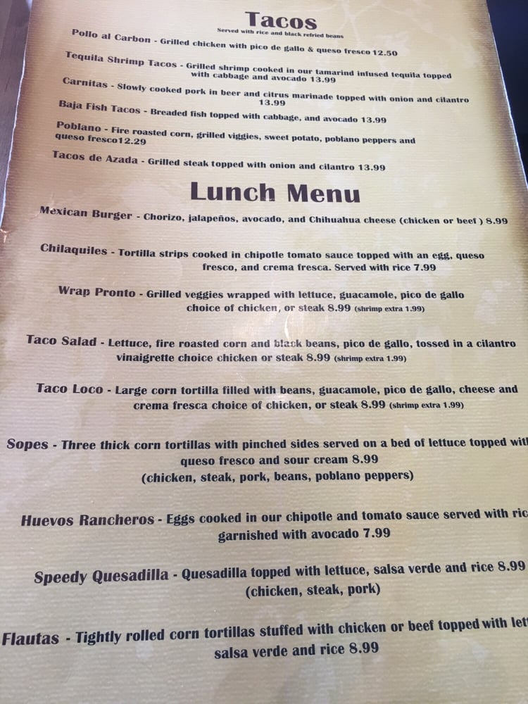 Corn tortilla, black refried beans, guacamole, pico de gallo, lettuce, queso y crema fresca. Choice of chicken, steak, pork, or shrimp.