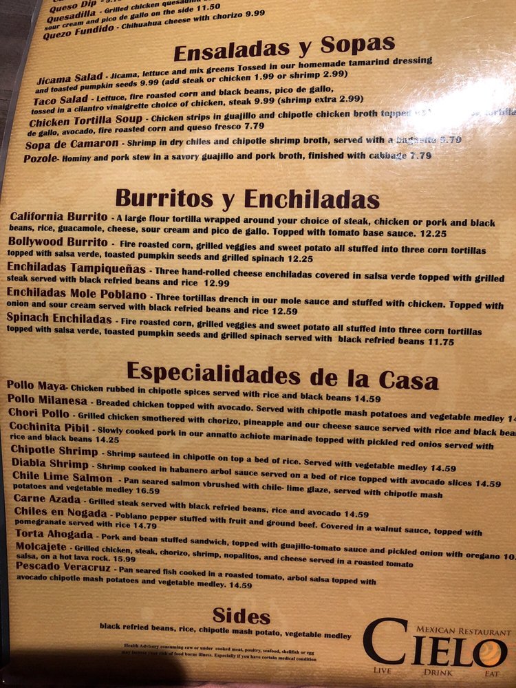 Cielo Mexican Restaurant in Braintree, MA offers a diverse menu with options for everyone, including Vegan and Limited Vegetarian choices. The restaurant provides a cozy atmosphere with friendly staff, making it a perfect spot for a casual night out or a family dinner. Some popular dishes include the Queso Dip, Tequila Shrimp Tacos, and Enchiladas Mole Poblano. Customers rave about the flavorful cocktails, generous portion sizes, and the decadent Cielo dip loaded with shrimp, steak, chicken, and queso. The overall dining experience at Cielo Mexican Restaurant is highly praised for its attentive service, delicious food, and vibrant ambiance. Whether you're a margarita aficionado or a lover of Mexican cuisine, Cielo is a must-visit spot for a memorable dining experience.